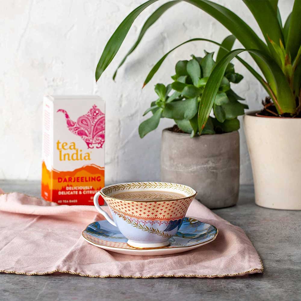 - infuse 1 Darjeeling tea bag with freshly boiled water for 3–5 minutes,And add milk and sugar to taste.