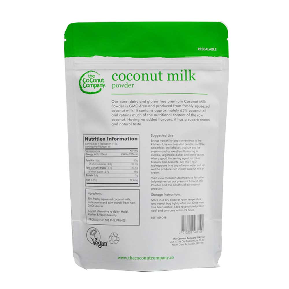 Buy The Coconut Company Vegan Coconut Milk Powder 250g online from cellsii.com. Our pure, dairy and gluten-free premium coconut milk powder is GMO-free and produced from freshly-squeezed coconut milk. It contains approximately 65% coconut oil content and retains much of the nutritional content of the raw coconut. It has a natural, sweet coconutty aroma and taste.