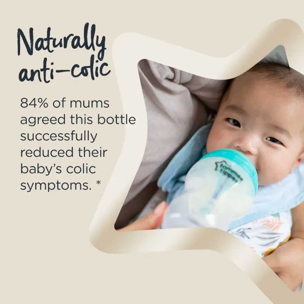- Tommee Tippee anti colic baby bottles have an Anti-colic tube that draws air away from milk to reduce colic symptoms for less wind, less reflux and less discomfort.