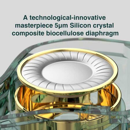 - A technological-innovative masterpiece 5μm Silicon crystal composite biocellulose diaphragm: Sillicon crystal composite biocellulose diaphragm is 2 times more efficient compared to conventional biocellulose diaphragm, thus can be driven easily. This extends the frequency range, allowing excellent transient response even when driven by smartphones.