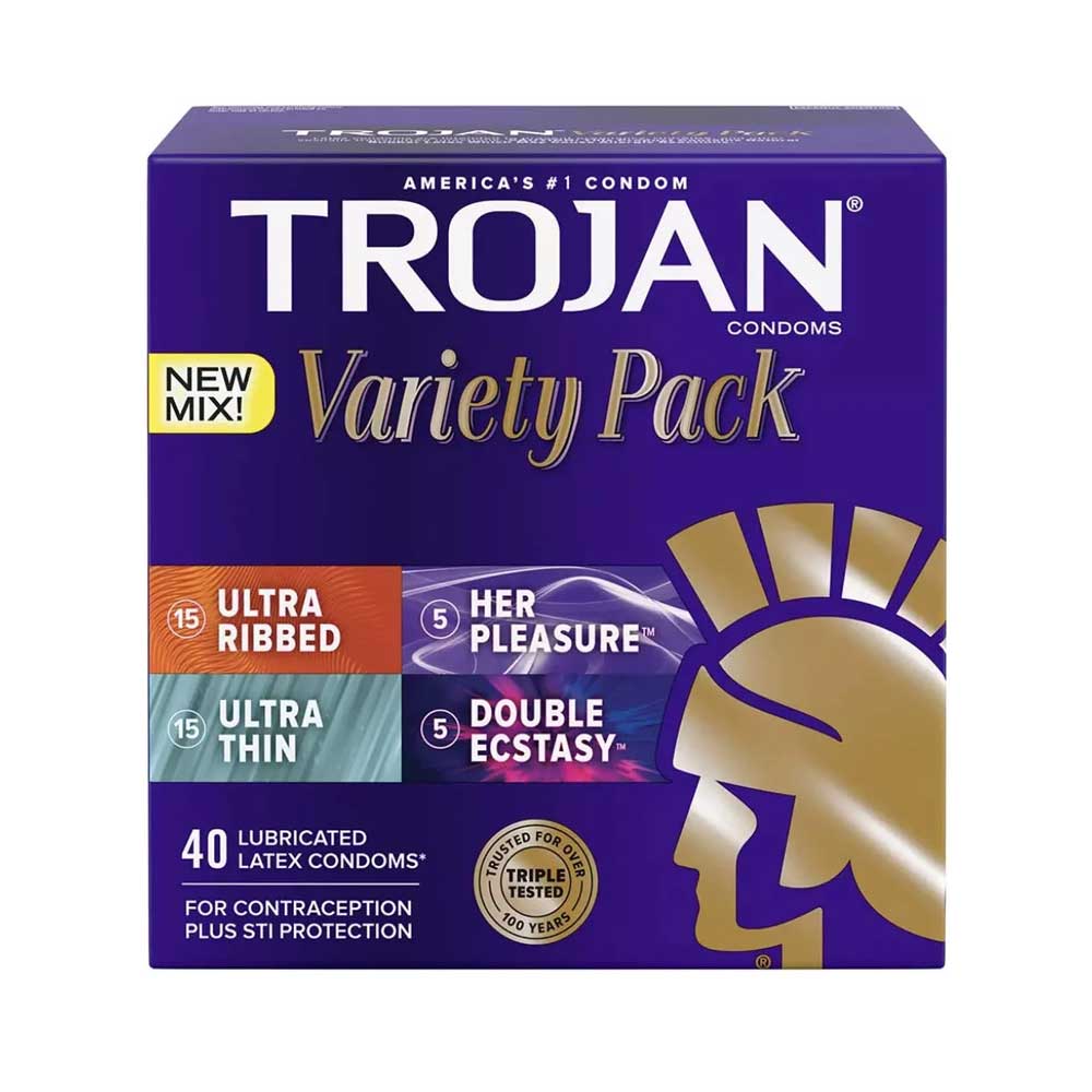 Buy Trojan Variety Pack Condoms 40 Pcs online from Cellsii.com. Features an assortment of our most stimulating condoms. Includes Trojan Twisted, Trojan Her Pleasure Sensations, Trojan Intense, and Trojan Warming condoms. Premium quality latex that helps reduce the risk of unintended pregnancy and sexually transmitted infections. Electronically tested to help ensure reliability.