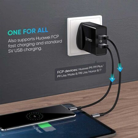 - Not Only Support QC Charging, But Also Support FCP and BC 1.2 Charging: This USB Travel Charger complies with Huawei FCP(Fast Charge Protocol), Charging Huawei phones as fast as the original adapter. Also support standard charging for non quick charging device such as iPhone, iPad, tablet, power bank for optimal charging.