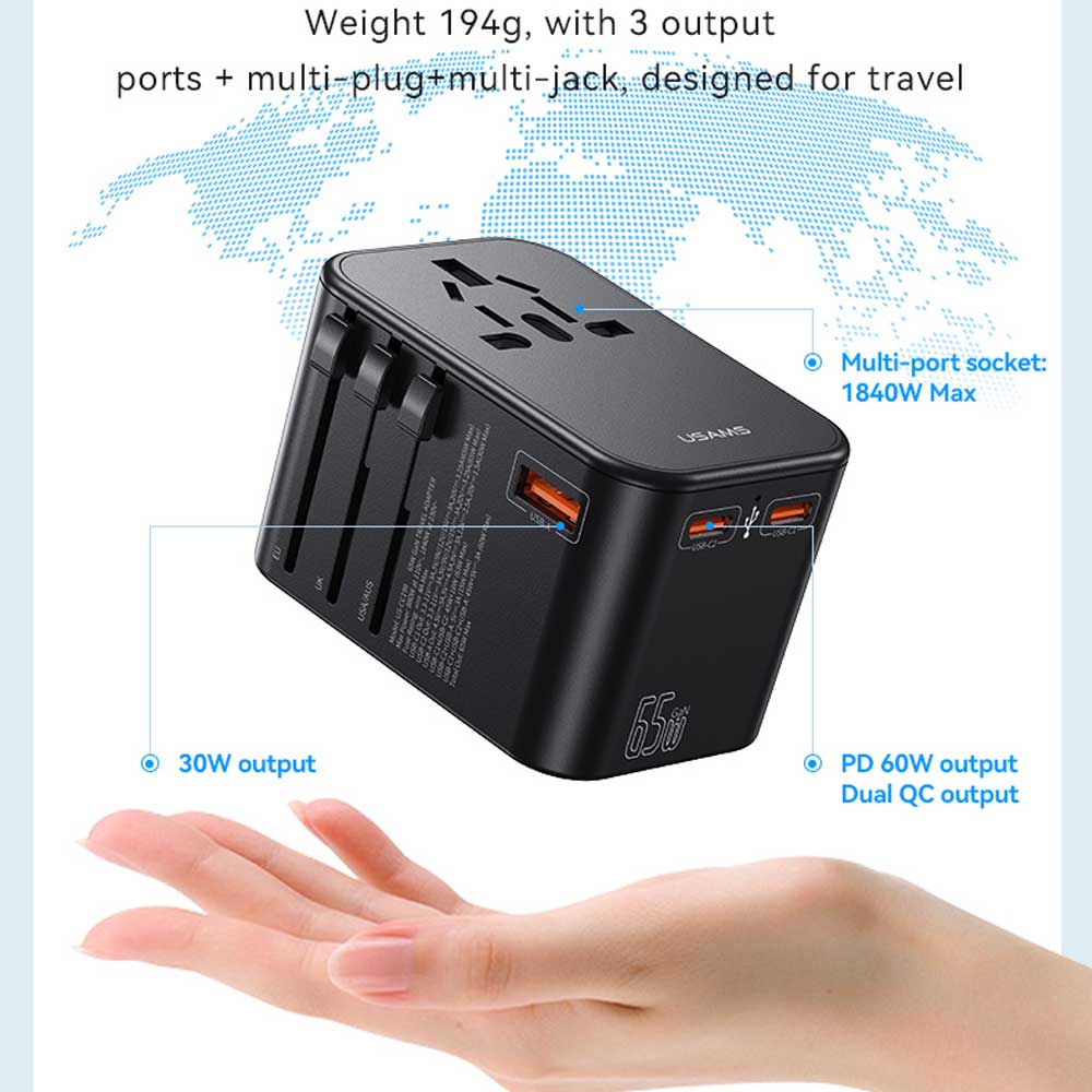 - Usams GaN 65W fast charging universal travel charger applicable in 200+ countries/area.