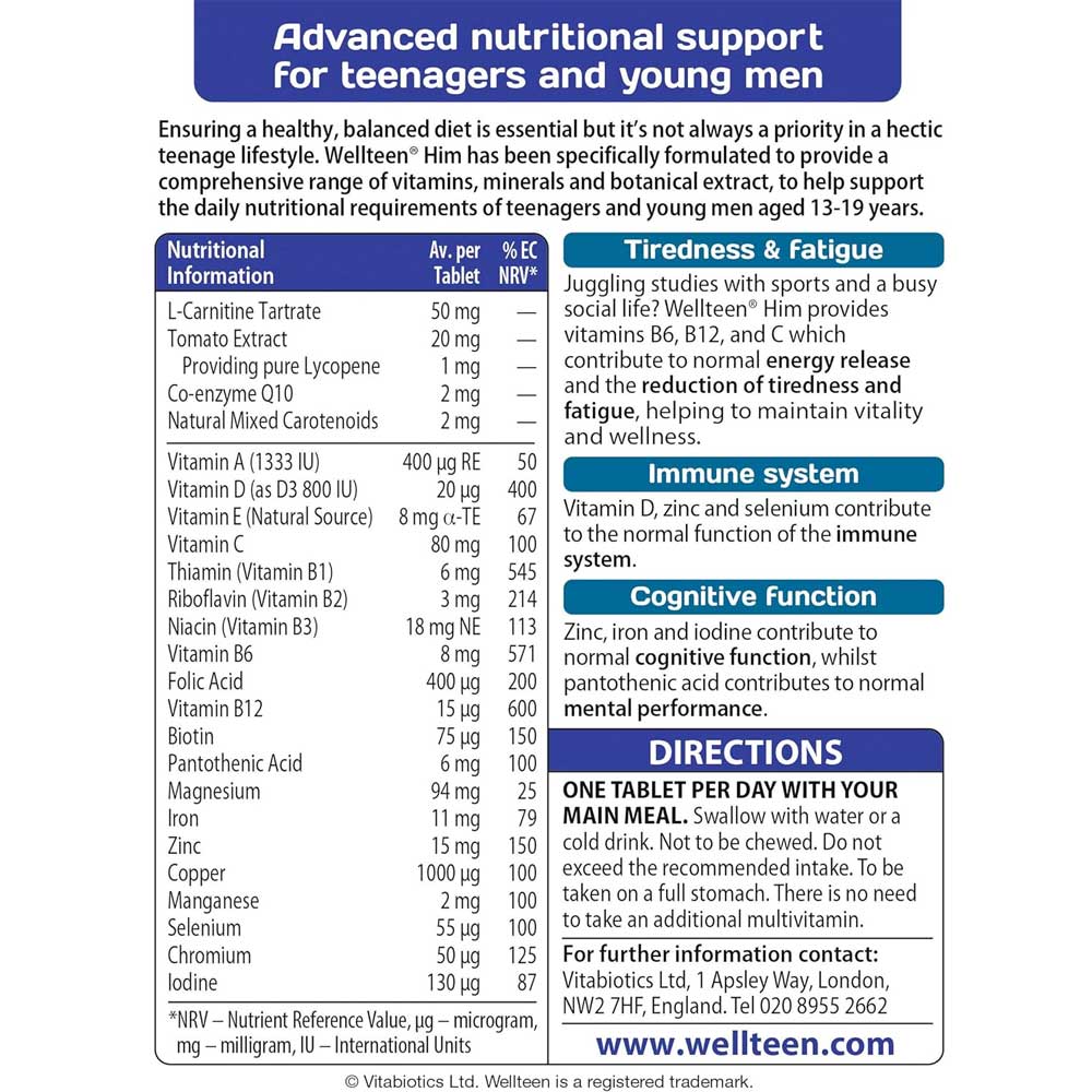 - Juggling studies and sports and busy social life? Wellteen Him provides vitamins B6, B12, and C that contributes to the normal release of energy and the reduction of tiredness and fatigue, helping to maintain vitality and well-being.