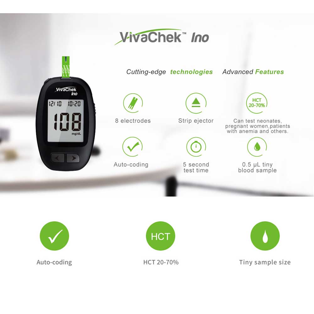 Buy VivaChek Ino Blood Glucose Monitoring System online from Cellsii. The VivaChek Ino glucose meter is a device for controlling blood glucose. Innovative 8-electrode technology on each test strip provides reliable results across a wide range of hematocrit, humidity and operating temperatures.