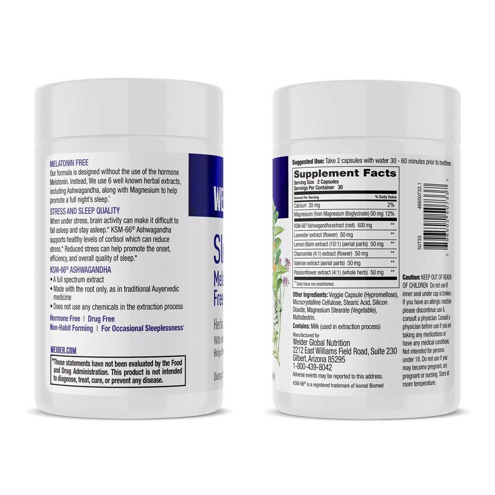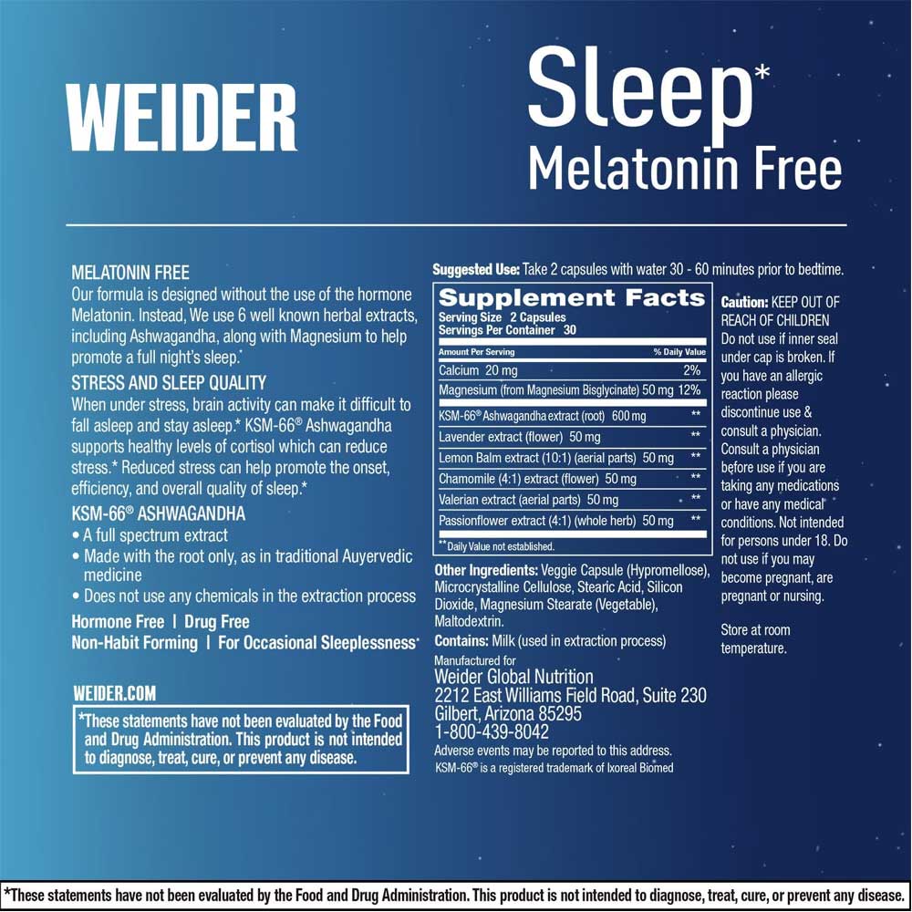 Buy Weider Sleep Melatonin Free Herbal Extracts + Magnesium 60 Capsules online from Cellsii. Sleep is a process that benefits from consistency. To evaluate how well this products new approach works on occasional sleeplessness, please use as directed every night for a week.