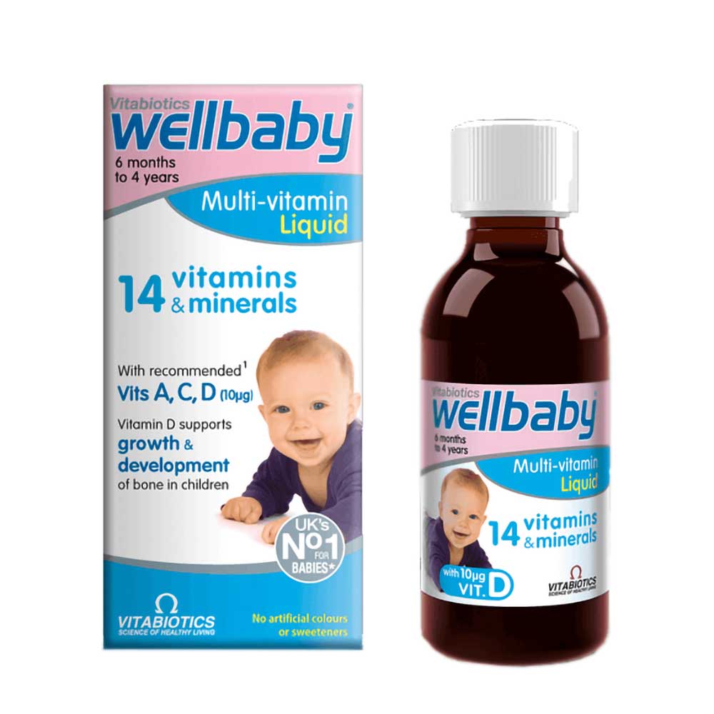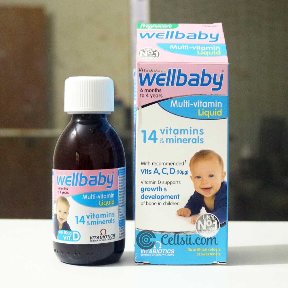 Buy Vitabiotics Wellbaby Multi-vitamin Liquid 150ml online from Cellsii.com. For your baby's vital years, this includes a source of 14 important vitamins and minerals to support a time of rapid growth and development. No other supplement for babies and young children provides such a comprehensive combination of 14 vitamins and minerals, plus Swiss Alpine Malt.