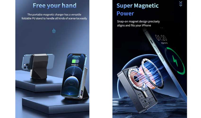 - The magnetic wireless portable charger has a versatile foldable stand to hold your phone in place. Attach your phone to it vertical or horizontal to get a more comfortable view when using your phone for chatting, video, or watching movies.