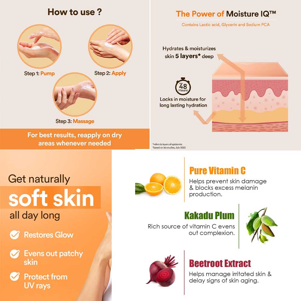 - The lotion helps to deliver high potency of vitamin C because of the vitamin enriched actives like Kakadu plum and stabilised pure vitamin C.