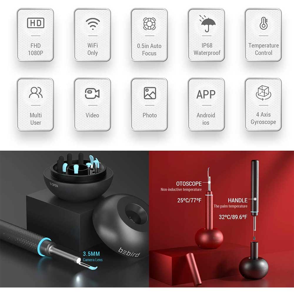 - High Definition Camera: Revolutionary 3.0 Megapixels HD Camera Technology, 141*13*13mm Lens with 6 LED Lights, which has Anti-Fog & Anti-Dust Technology, you can use in homecare and more Industrial areas. It is convenient for daily inspection of ear, nose, mouth, throat and other health conditions. All of Bebird Models with Constant Temperature Never is too cold or too hot, closing to the human body's temperature, care your ears.