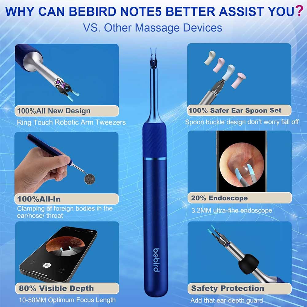 - Earwax removal kit with 360° wide-angle lens, LED shadowless light, 6 gyroscopes, and the thinnest 3.2mm otoscope camera on the market. With its 10MPX sensor, Bebird ear cleaner gives you a view of the deepest part of the ear canal. You can also use it to see your nose, mouth, or eyes. Experimenting with Bebird Pro N3 Pro earwax removal camera is a pleasure.