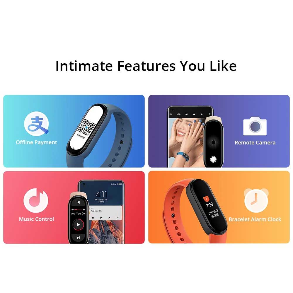 - Other features: Message/call notification, App alerts, Calendar, Alarm, Clock, Stopwatch, Timer, Music control, Find phone, Unlock phone(MIUI), Camera remote shutter, Weather, Set activity goals
