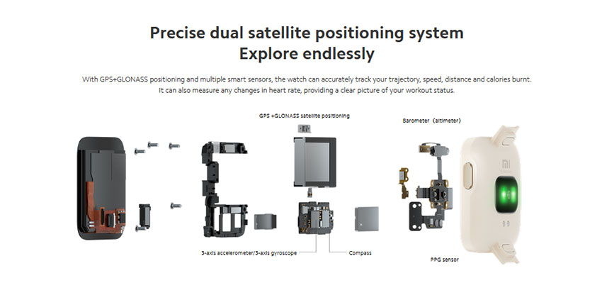 - Precise dual satellite positioning system Explore endlessly: With GPS+GLONASS positioning and multiple smart sensors, the watch can accurately track your trajectory, speed, distance and calories burnt. It can also measure any changes in heart rate, providing a clear picture of your workout status.