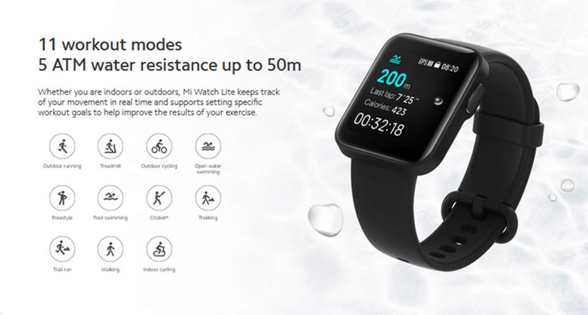 - 11 workout modes 5 ATM water resistance up to 50m: Whether you are indoors or outdoors, Mi Watch Lite keeps track of your movement in real time and supports setting specific workout goals to help improve the results of your exercise.