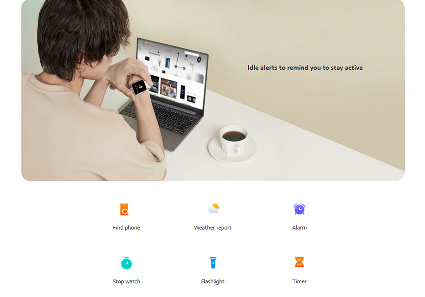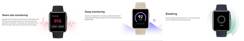 - Health & Daily Life: Heart Rate Monitoring, Sleep Monitoring, Breathing, Notifications, Weather, Clock, Alarm, Flashlight, Music Control