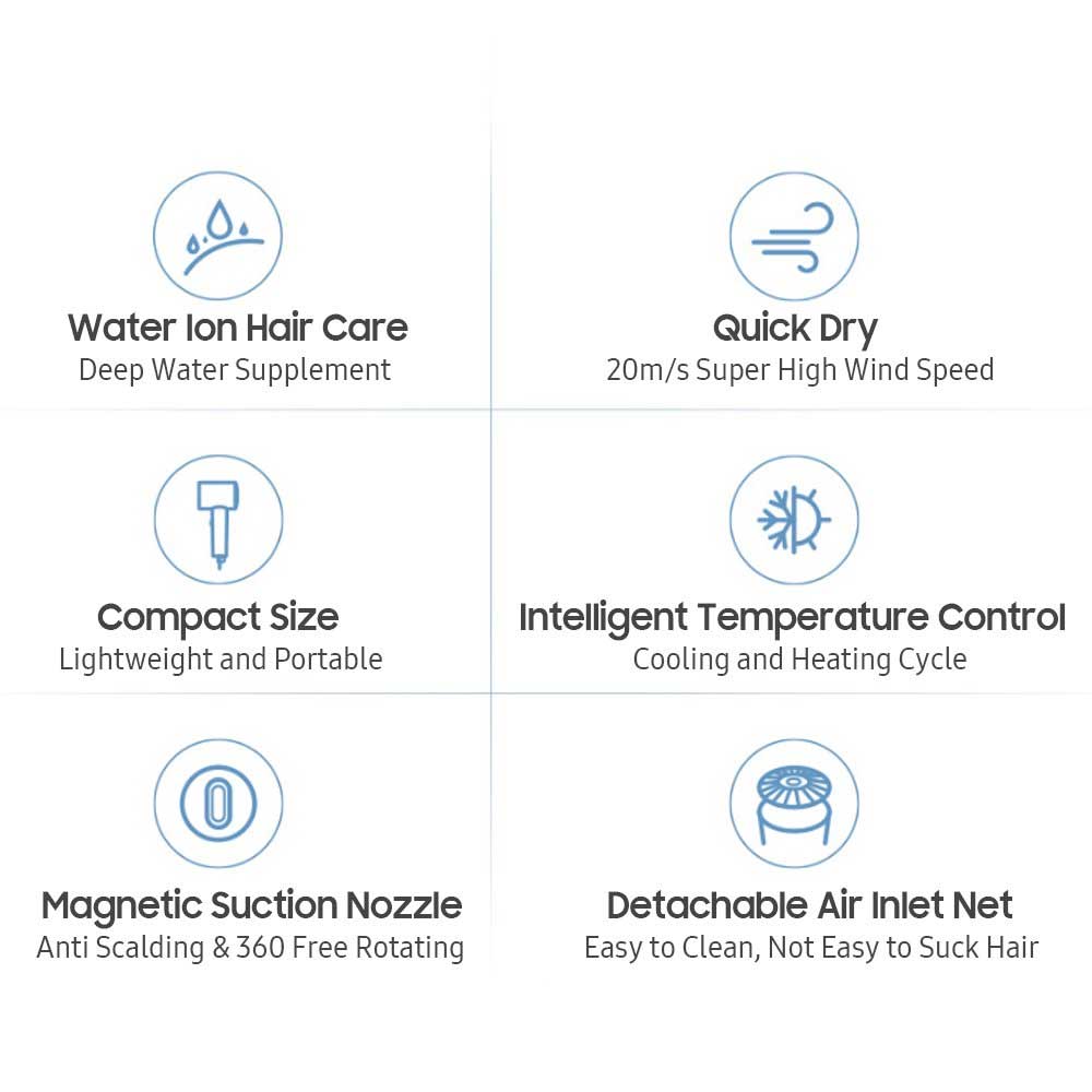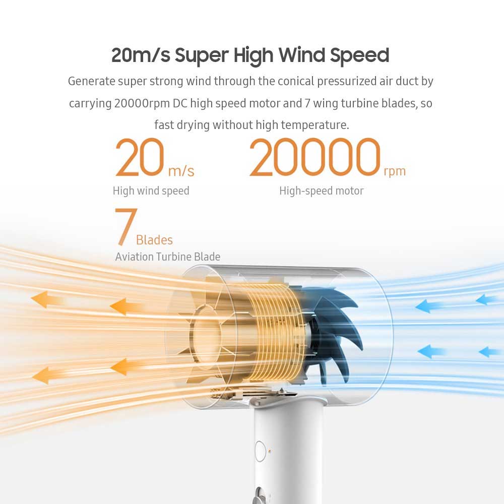 - High-speed motor, fast drying hair, wind speed of up to 20m/s.