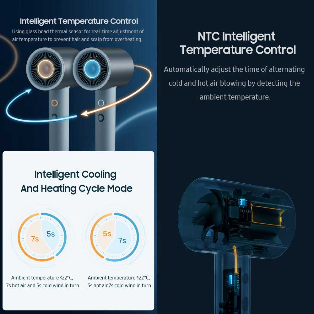 - The built-in heat detector can adjust the air temperature in real time to prevent hair from overheating and injury.