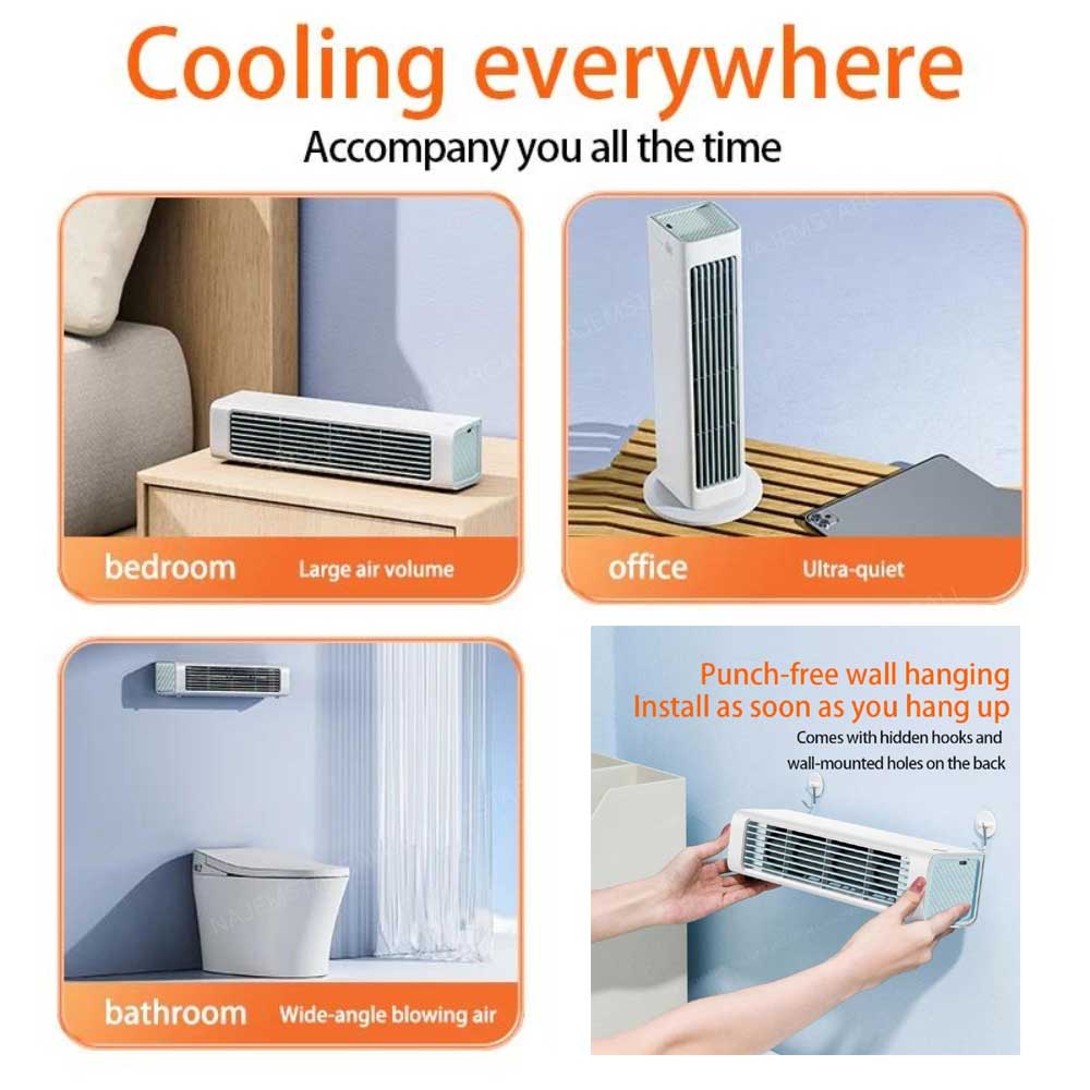 This fan boasts a sleek and compact design, suitable for mounting on a wall or using on a desk. Its powerful 4000mAh battery guarantees extended use, providing up to 12 hours of cool air to keep you comfortable in any setting.