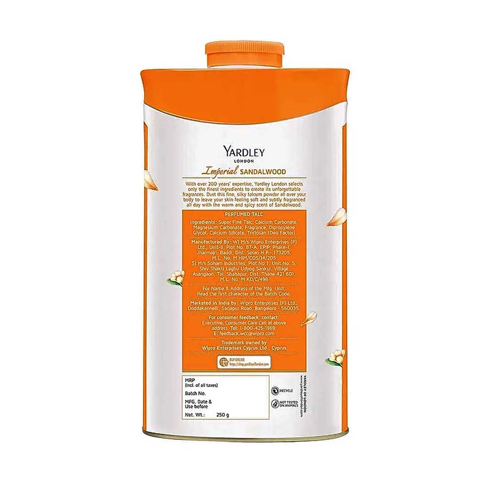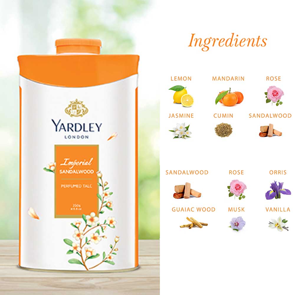 Buy Yardley London Imperial Sandalwood Perfumed Talc 250g online from cellsii. A rich, distinctive scent with a feather-soft feel the Imperial Sandalwood Perfumed Talc by Yardley is for the woman who enjoys contradictions. Pamper yourself with this warm, spicily scented powder for a whole day of invigorating freshness.