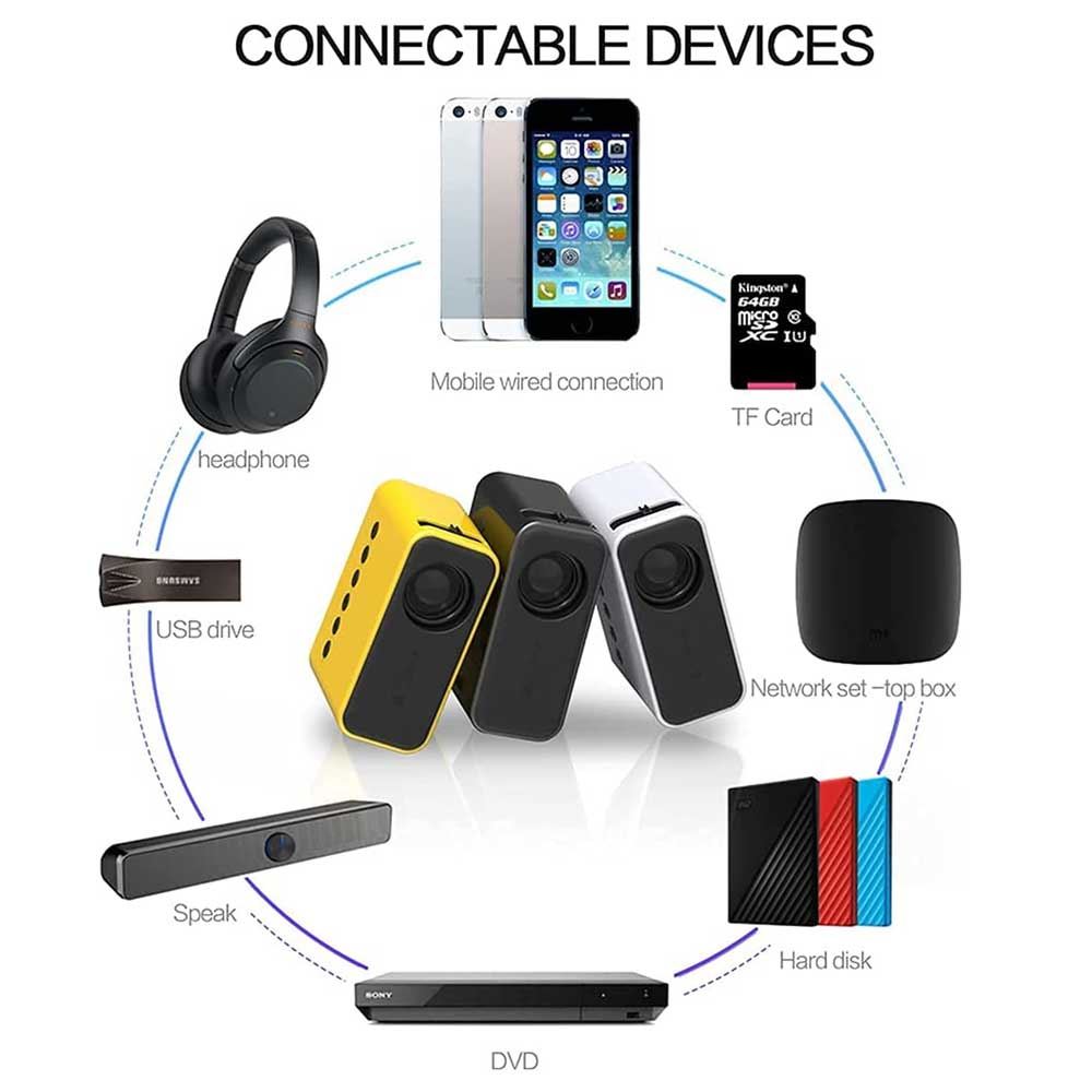 Buy YT500 LED Support Portable Mini Projector online in Bangladesh from Cellsii.com at best price. The mini projector has a 16~100 inches projection display size with 0.5m to 4m projection distance. Built-in speakers offer excellent loud sound quality, you can also connect it to external speakers to meet your higher quality sound needs. This portable movie projector is fit for playing videos, TV series, photos sharing, football matches etc. It can be easily connected with laptops, smartphones, tablets, USB drives, X-Box ONE to enjoy big games.