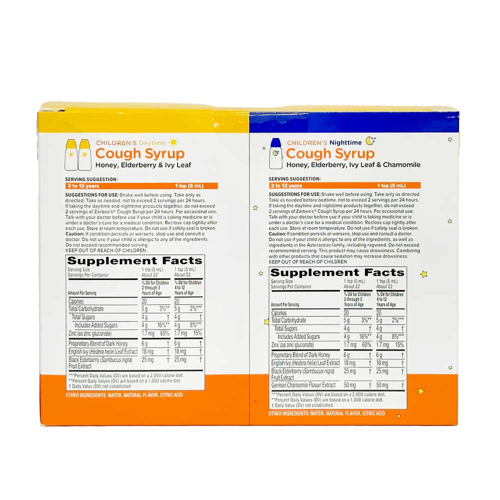 Buy Zarbee's Child Natural Cough Syrup 2 Daytime Packs & 1 Nighttime 354ml online from cellsii.com. The main ingredient, dark honey, Soothes cough associated with hoarseness, Dry throat and irritants. Day time cough syrup contains honey, Elderberry & Ivy Leaf. Night time cough syrup contains honey, Elderberry, Ivy leaf and chamomile.