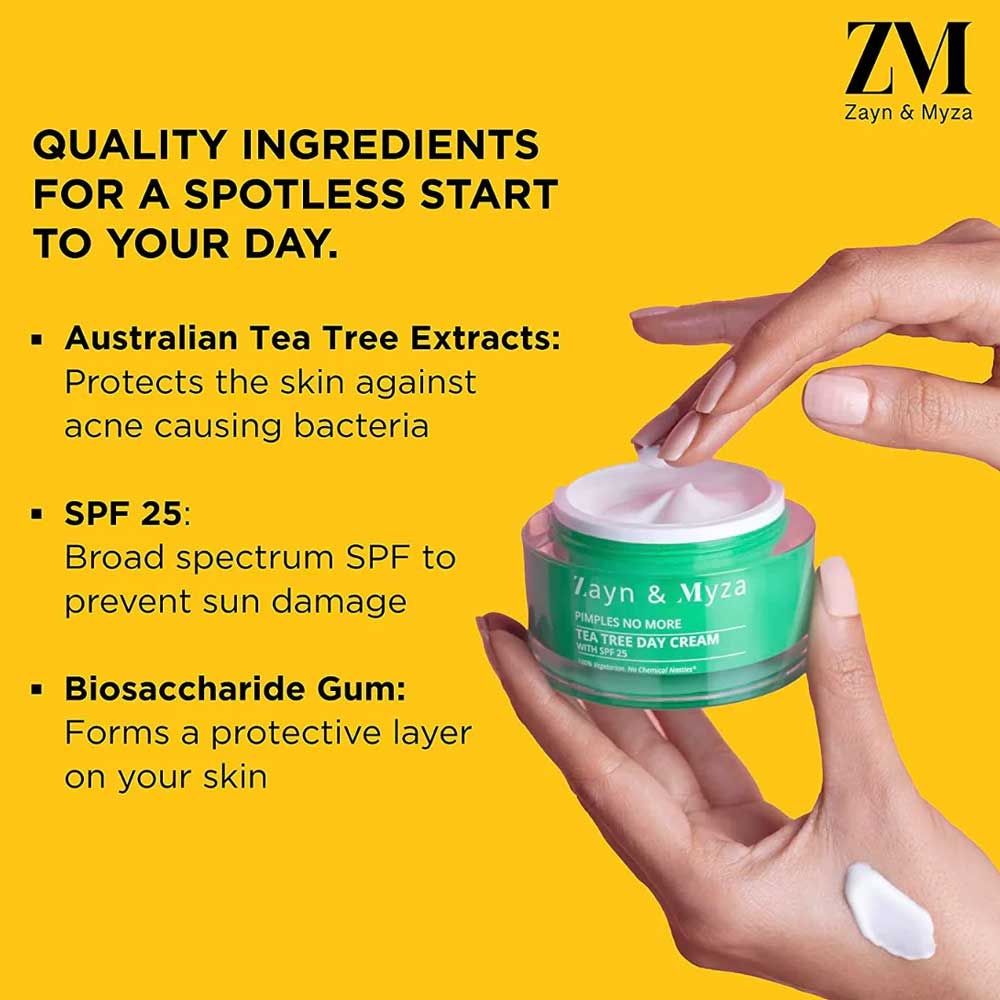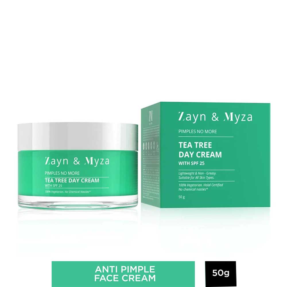 Buy Zayn & Myza Tea Tree SPF 25 Day Cream 50g online from Cellsii. The Tea Tree & Salicylic acid day cream has anti-inflammatory and antibacterial goodness that kills acne causing bacteria, reduces pimples and soothes redness and inflamed skin. This non-sticky and non-greasy anti-acne face cream forms a light and breathable layer on your skin and doesn’t clog your pores.