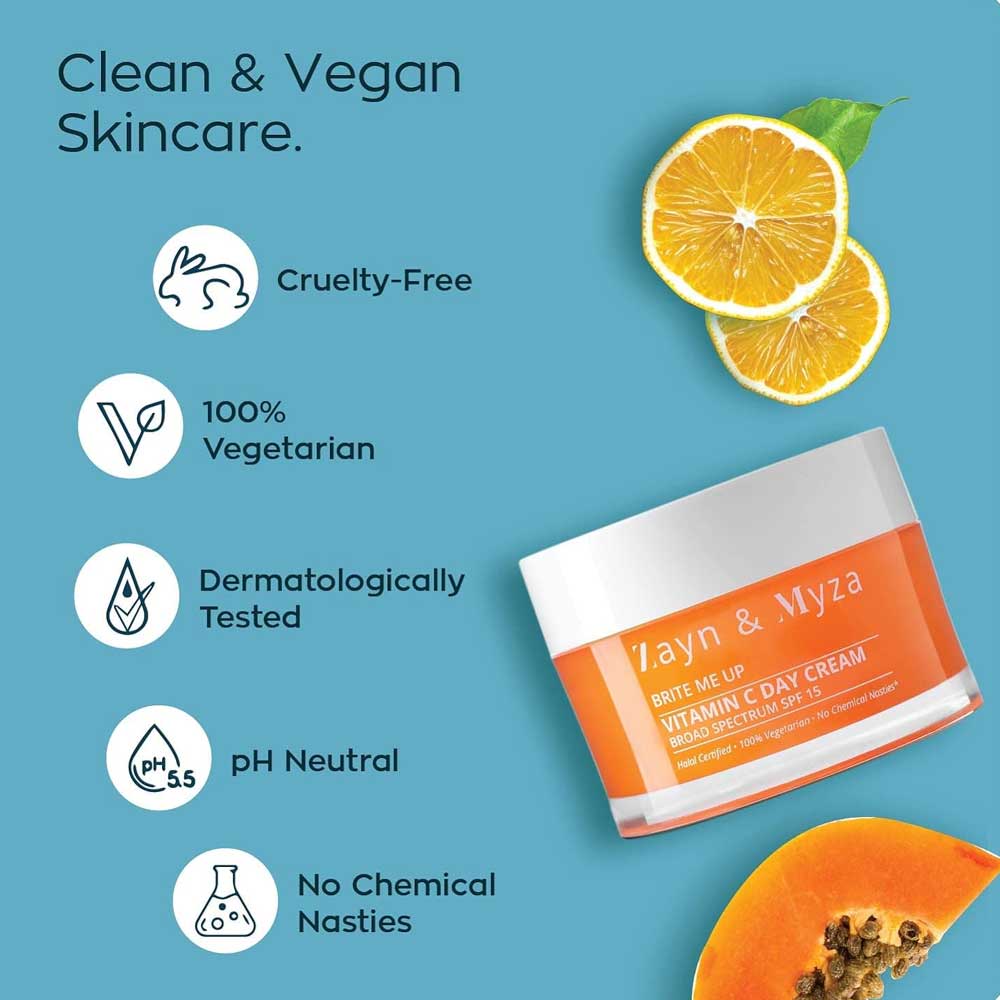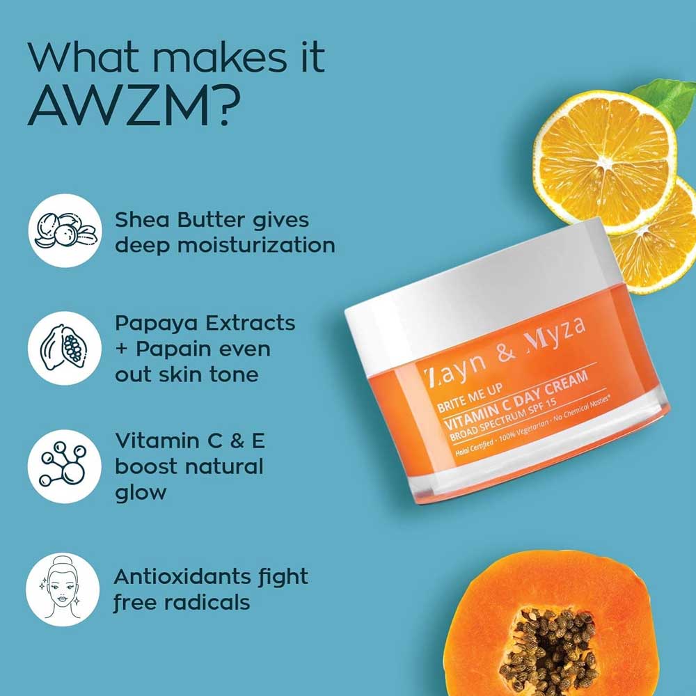 Buy Zayn & Myza Brightening Vitamin C SPF 15 Day Cream 50g online from Cellsii. A face cream for glowing skin that’s infused with antioxidant-rich brightening Vitamin C that brightens, rejuvenates your skin, and faces-off with dull skin. The Vitamin C Face Cream is enriched with Papaya extracts and Shea Butter, that instantly hydrates and gives deep moisturization.