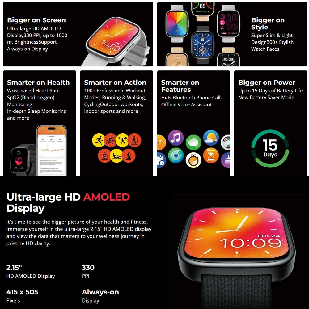 - It's time to see the bigger picture of your health and fitness. Immerse yourself in the ultra-large 2.15" HD AMOLED display and view the data that matters to your wellness journey in pristine HD clarity.