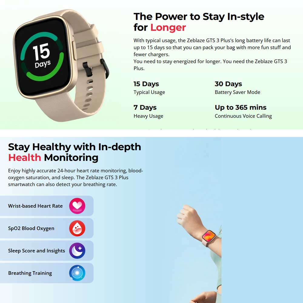 - With typical usage, the Zeblaze GTS 3 Plus's long battery life can last up to 15 days so that you can pack your bag with more fun stuff and fewer chargers. You need to stay energized for longer. You need the Zeblaze GTS 3 Plus.